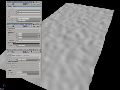 From the Get > Primitive > Polygon Mesh menu chose Grid. In the PPG set the U Length to 20, the V Length to 10 and change the U Subdivisions to 100 and the V to 50. Next, add a Randomize operator from the Modify > Deform menu. In the PPG, set the X,Y and Z Displacement 0.1 and the Repetitions to 15. From the Modify > Deform menu, chose Smooth. In the PPG, set the Strength to 5.Step 2